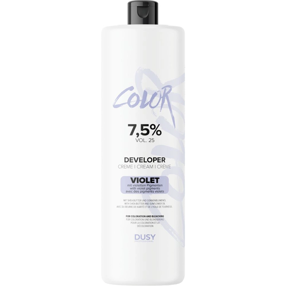 Dusy Professional Color Developer Violet to profesjonalny oksydant z dodatkiem fioletowych pigmentów, stworzony do koloryzacji blondów, platyny oraz włosów siwych. Formuła wzbogacona masłem shea i olejem słonecznikowym wspiera kondycję włosów podczas farbowania, jednocześnie skutecznie neutralizując niepożądane ciepłe tony. Produkt dostępny jest w stężeniach 1,5% oraz 7,5%, co pozwala precyzyjnie dopasować go do konkretnej usługi koloryzacyjnej.